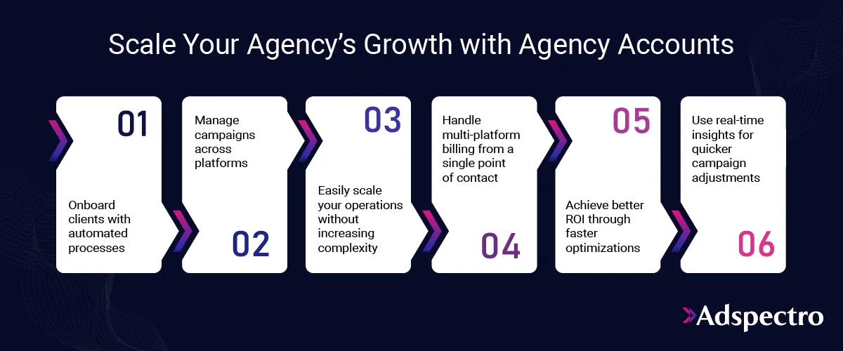 Agency accounts provide a unified way to overcome these hurdles by offering streamlined access and operational efficiency across multiple platforms. These accounts are designed to support businesses, so they can truly focus on achieving measurable results. Adspectro, for instance, provides agency accounts that redefine how you approach advertising options.